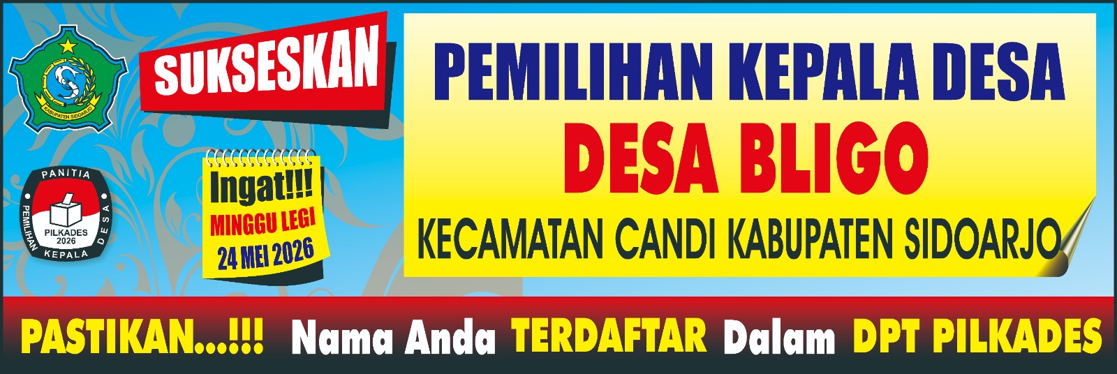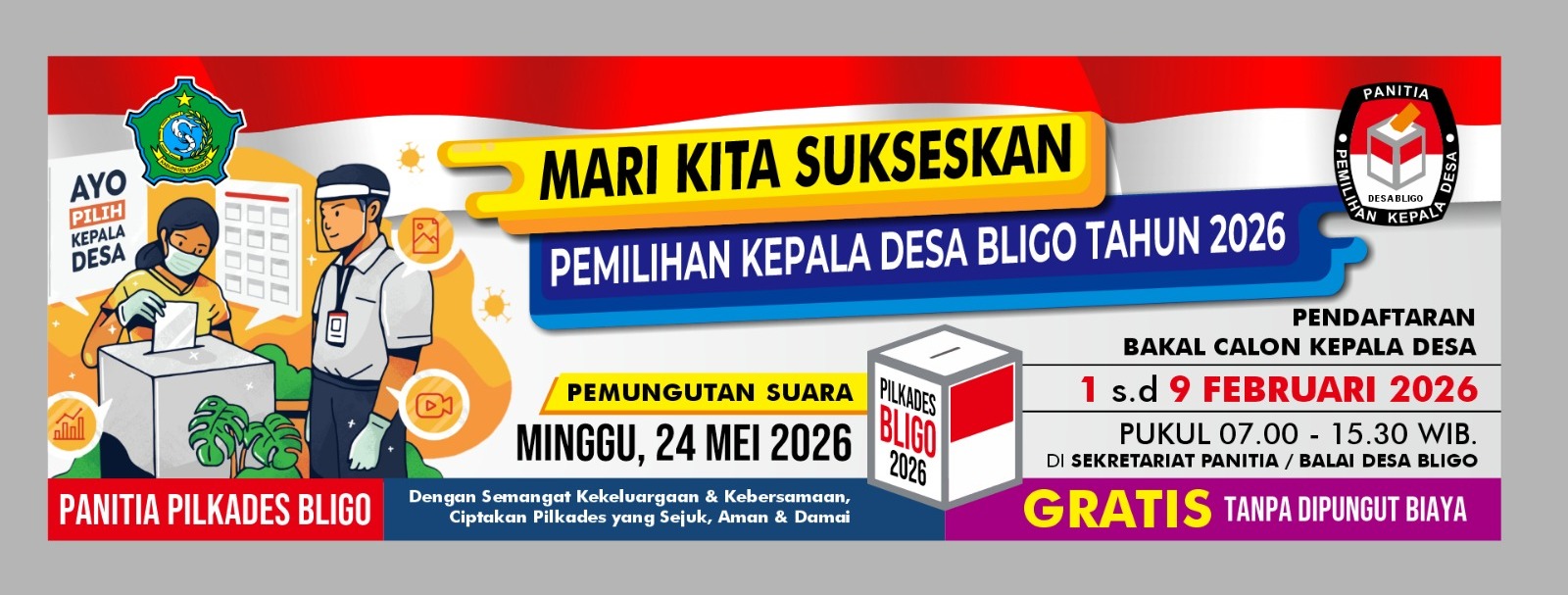 PANITIA PILKADES DESA BLIGO - Kamis, 01 Jan 2026 "MARI KITA SUKSESKAN PEMILIHAN PILKADES DESA BLIGO 2025 DENGAN DAMAI KONDUSIF DAN AMAN". Pastikan nama anda terdaftar dalam DPT PILKADES Desa Bligo Tahun 2025