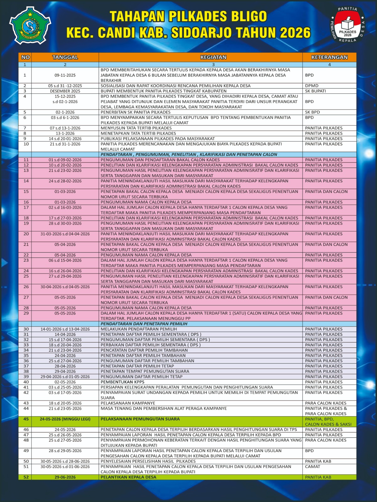 DESA BLIGO - PANITIA PILKADES Kamis, 01 Januari 2026 Panitia Pilkades menginformasikan Tahapan PILKADES Desa Bligo Tahun 2026. Untuk Informasi lebih lanjut dapat langsung menghubungi Sekretariat Panitia PILKADES yang bertempat di Kantor/ Balai Desa Bligo Jl. Wijaya Kusuma No. 05 Desa Bligo Kecamatan Candi Kabupaten Sidoarjo.