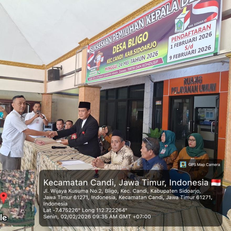 PANITIA PILKADES BLIGO | Senin, 2 Februari 2026 bertempat di Sekretariat Panitia Pilkades Desa Bligo Kecamatan Candi Kabupaten Sidoarjo Propinsi Jawa Timur, Ketua Panitia Pilkades Desa Bligo Bpk. Drs. Imam Wahyudi menyampaikan Tahapan Pilkades yaitu Pembukaan Pendaftaran secara resmi dibuka pada tanggal 01 Februari 2026 s.d 09 Februari 2026, beliau menyampaikan pada hari ini senin sudah ada Bakal Calon Kepala Desa Bligo yang melamar dan secara langsung datang ke sekretariat panitia pilkades untuk menyerahkan berkas administrasi lamaran Bakal Calon Kepala Desa Bligo. Pendaftar yang melamar sebagai Bakal Calon Kepala Desa Bligo adalah Sdr.Bpk Doni Suhendo. Secara resmi sesuai tahapan Panitia juga akan menunggu Bakal Calon Kepala Desa Bligo yang berminat mendaftarkan diri sampai dengan tanggal 09 Februari 2026.